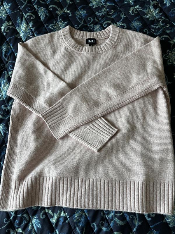 This crewneck sweater is super soft and the muted pink color make it very feminine. it's really cozy and warm--perfect for a cool winter day or evening. The ribbed detail at neck, hem, wrists and sidelines make it a perfect match with jeans. I ordered a size small, and it's more like a medium fit overall.