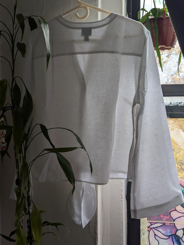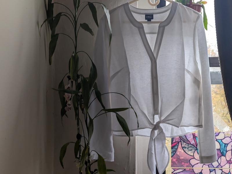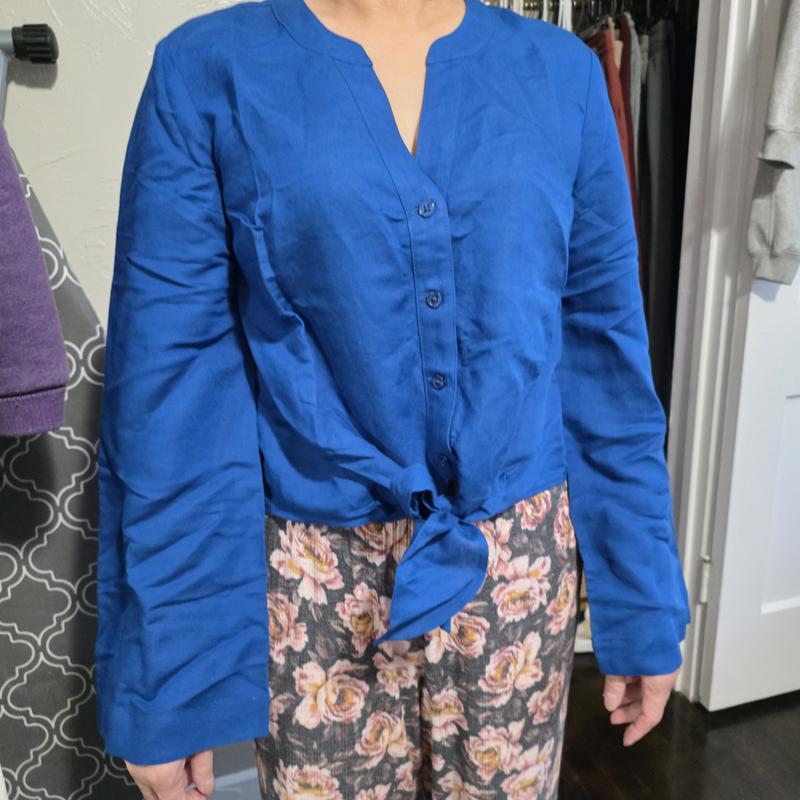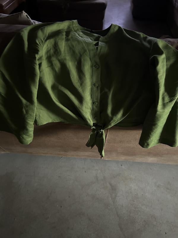 This blouse is a must have. The fabric is soft and consists of 55% linen and 45% viscose. The fabric does not appear wrinkled and it feels comfortable on the skin. The care instruction said to machine wash in cold water on the gentle cycle with like colors, line dry and use a cool iron when needed. I would definitely hand wash this blouse and hand it in my bathroom to dry. I love the collarless neckline which extends into a deep V neck cut that gives the blouse a striking appearance . The sleeves are long and bell shaped at the ends. The tie-front adds a nice touch to the blouse. All these styles combined are eye catching and makes this blouse very trendy and fashionable . I love it.
