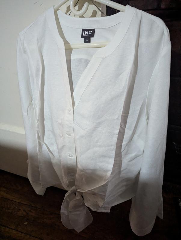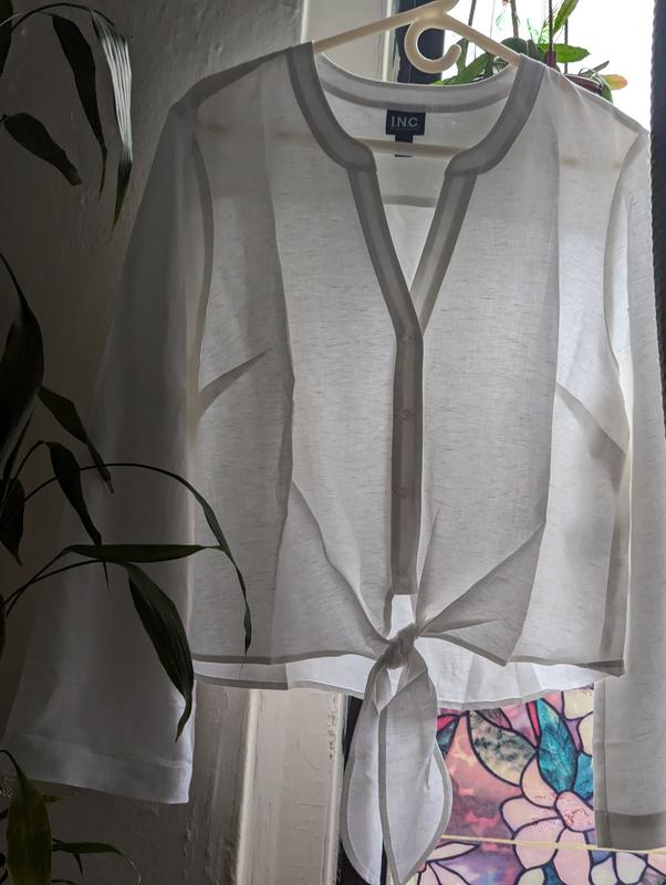 INC with this top have returned to nice clothing. This top is beautiful made and the color is phenomenal. It is a nice weight linen and I couldn’t be happier with it. Have received numerous compliments. It washes and wears very well. It’s a thicker weight linen so it doesn’t easily wrinkle and after handwashing I noticed no loss of color. It does run a bit large, so you can size down.